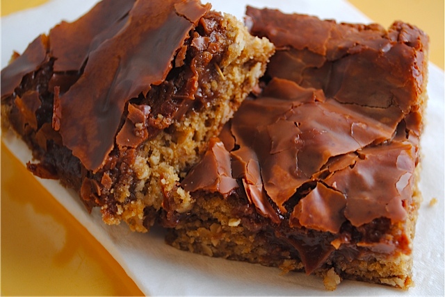 chewy oatmeal bar. thick layer of chocolatey fudge. mmm.